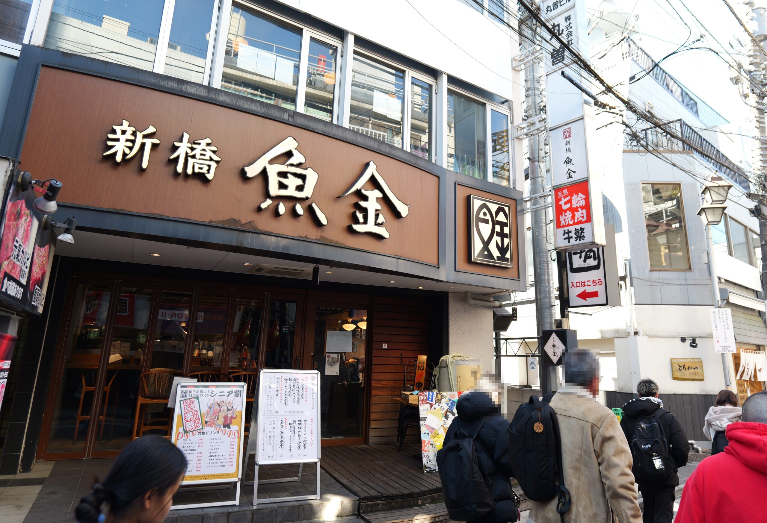 左手に新橋 魚金様ととんかつ いちよし様の看板が見えましたら、